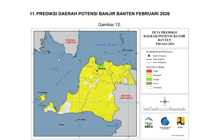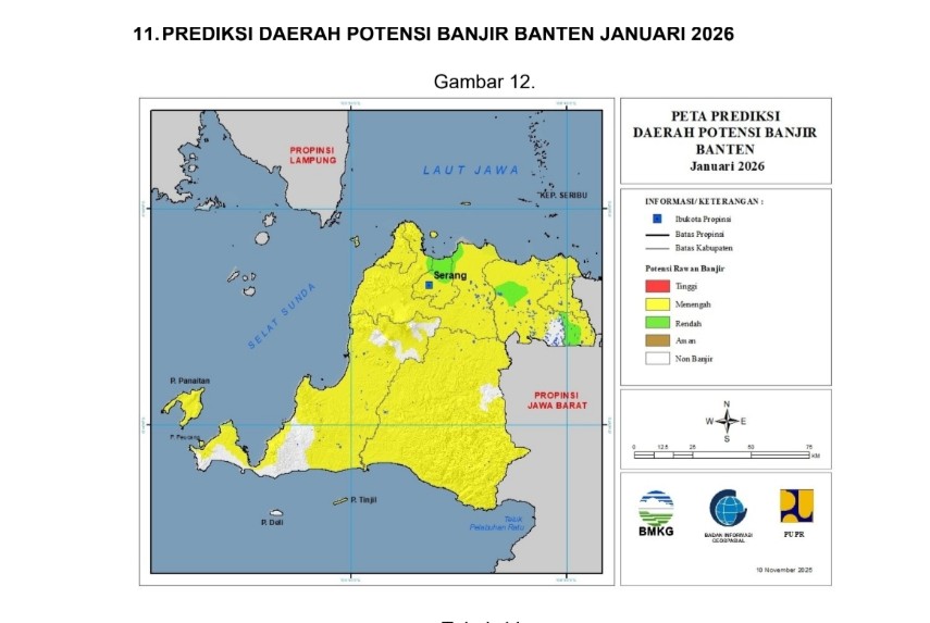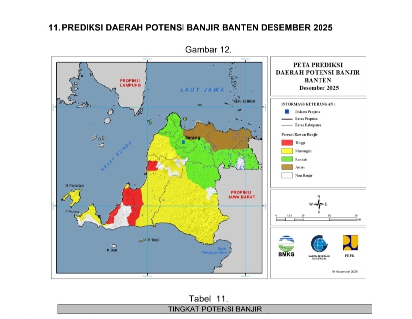 Berdasarkan data BMKG yang dirilis pada 10 November 2025, wilayah Banten memiliki varian tipe potensi banjir mulai dari potensi tinggi, potensi sedang hingga potensi rendah.